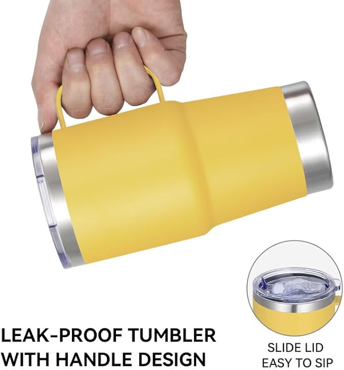 - Stainless Steel Tumblers with Handle: Made of 18/8 food grade stainless steel,it won't retain or transfer flavors with the electro polished inside and also sweat proof with colorful powder coating outside. 360-degree welded handle gives you a firm grip on your beverage.