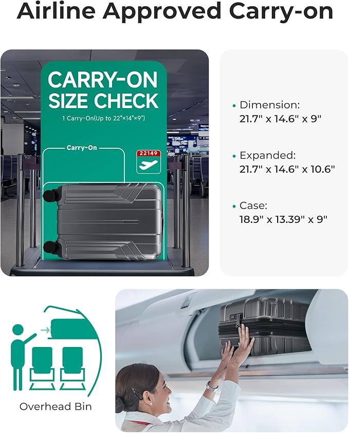 - Airline Approved Luggage - Dimensions: 22 x 14 x 9 inches (including wheel and handle height), Volume: 35 L and weighing only 6.83 lbs. The 22 x 14 x 9 carry-on luggage is designed to meet the carry-on limitations of most major airlines worldwide. It fits conveniently in the overhead compartment, eliminating additional handling fees.