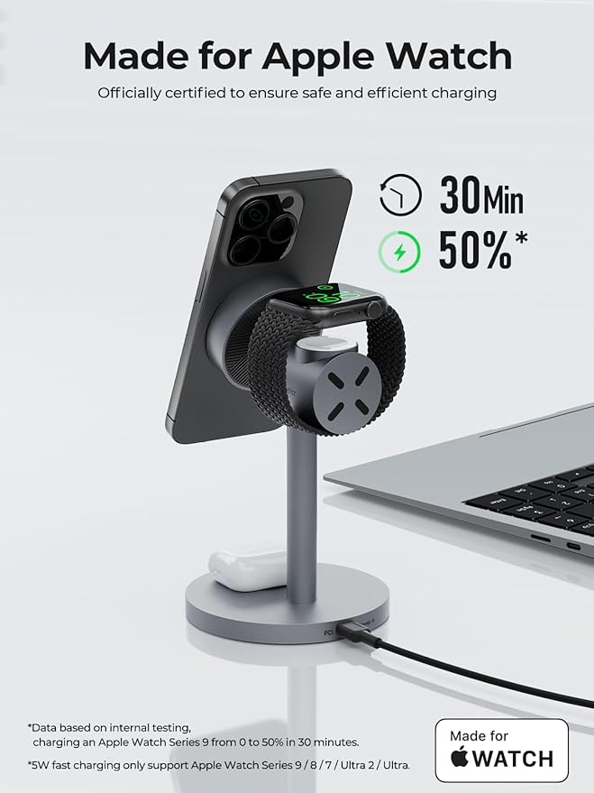 - Optimal Charging for Apple Watch: Our MFW-certified wireless charger ensures maximum performance and compatibility with Apple Watch. Providing up to 5W of power, it can charge up to 50% capacity in just 30 minutes for Apple Watch Series 9 or higher models