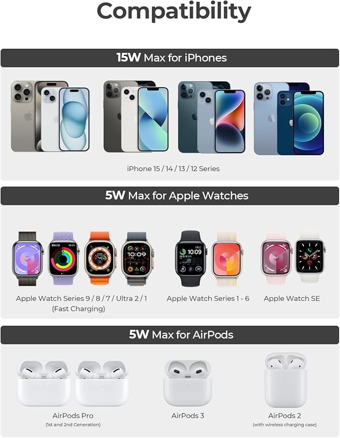 - Compatible Devices : iPhone 17/16/ 15 / 14 / 13 / 12 Series, AirPods Pro 2 / 1 / AirPods 4 /3 / 2 / Wireless Earbuds (with Wireless Charging Case), Apple Watch Ultra 2 / 1 / Apple Watch Series 10 / Series 1-9 / SE iPhone 17/16/ 15 / 14 / 13 / 12 Series, AirPods Pro 2 / 1 / AirPods 4 /3 / 2 / Wireless Earbuds (with Wireless Charging Case), Apple Watch Ultra 2 / 1 / Apple Watch Series 10 / Series 1-9 / SE