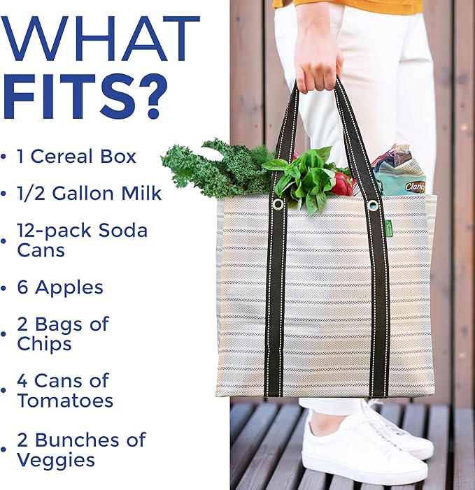 - Stylish & Built to Last: Crafted from lightweight woven polypropylene, this extra large grocery tote bag is water-resistant and sturdy. The reinforced hard bottom of these reusable bags for groceries stands up to rain, snow, & everyday wear and tear.