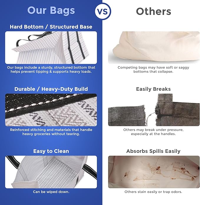 - Keeps Groceries in Place: These large reusable bags with handles feature a waterproof & flat PE board bottom for extra stability. This durable tote bag for groceries stays upright and secure in the trunk or at checkout—no more spills or tipping over!