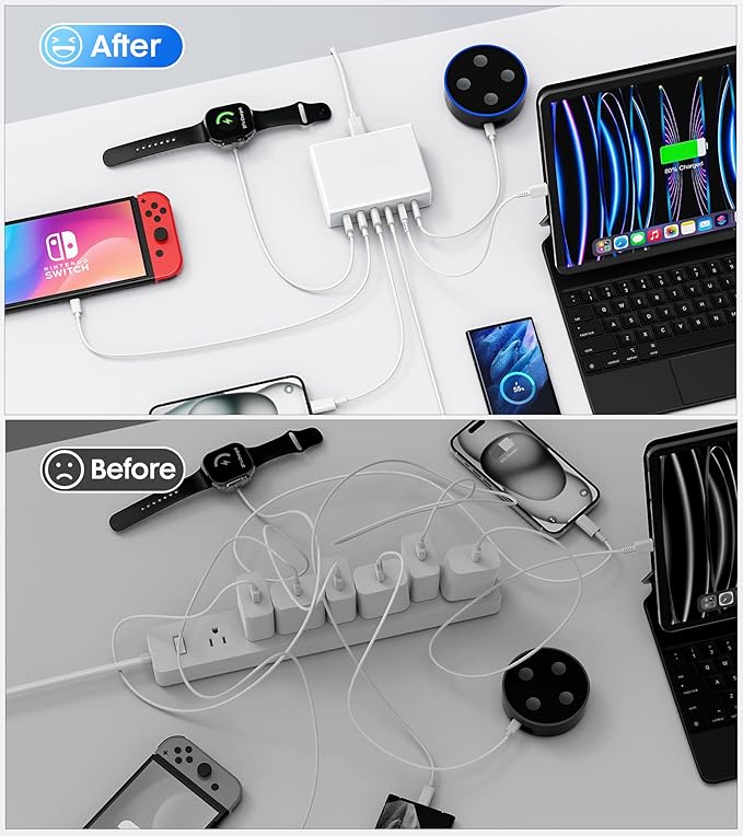 - 6-in-1 USB C Charger: With 4 USB-C Power Delivery port(each port 20W max) and 2 USB-A port(each port 20W max), you’re ready to charge six of your devices simultaneously. Equipped with a 5ft extension cord, it is not restricted by distance ( 6-Port Charging Station)This smart charger is equipped with 3 Type-C ports and 3 USB-A ports, with a total power of up to 120W, which can charge multiple devices at the same time, such as Android phones and iPhone, other tablets and other devices. It is the first choice for home, travel, office, etc