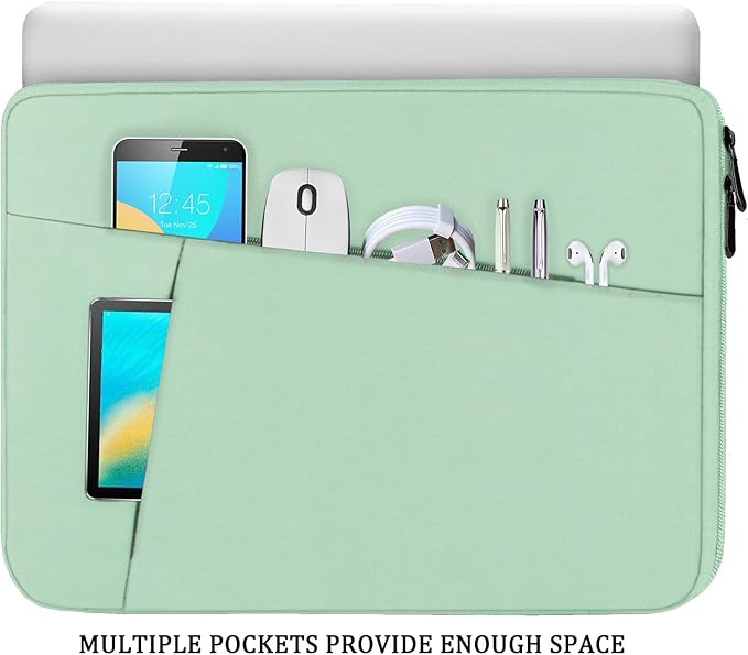 - EXTRA STORAGE SPACE: Extra two pocket in front for additional storage such as charger, power adaptors, external hard drive, earphone, cables, Portable Mouse, Keys, Cards, Pens, Cell Phone and other accessories etc. This protective carrying sleeve case bag with pocket is ideal for you to take your laptop notebook computer out.