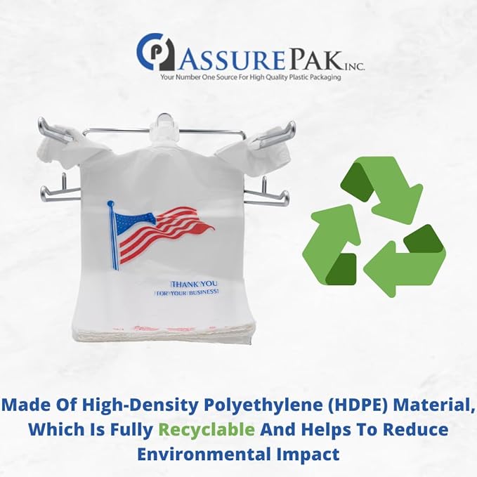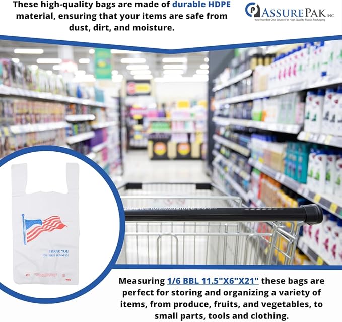 Easy Open HDPE Plastic Bag - 500 Bags/case - "American Flag" White T-Shirt Bag -1/6 BBL 11.5"x 6.5"x 21" - 18 microns - For Retail, Groceries, Merchandise, Convenience Store, Supermarket, Restaurant