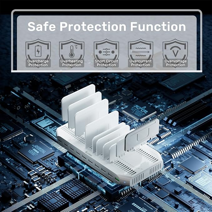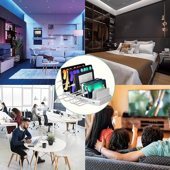 - 【Safety Certifications】Multi device charging station comes with a power adapter. The smart chip in each charging station protects against overcharging, overheating, overvoltage, and short circuits. The LED light will illuminate when the charging station is powered on
