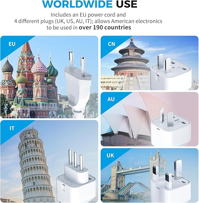 - ๐๏ธ๐๏ธ๐๏ธGlobal Compatibility: DOACE Travel Adapter Converter includes a 4-foot detachable EU power cord and 4 travel plug adapters (UK, US, AU, IT), allowing American electronics to be used in over 190 countries, includes France, Germany, Ukraine, Thailand, Bali, Vietnam, Canada, Mexico, Germany, Japan, China, Korea, India, Italy, Brazil, Europe, Asia, Israel, Antigua and Barbuda, Bulgaria, Cambodia, Dubai, UK, Fiji, Guam, Haiti, Hong Kong, Ireland, Malaysia, New Zealand, Peru, Puerto Rico, Singapore, Egypt, Turkey, and more.