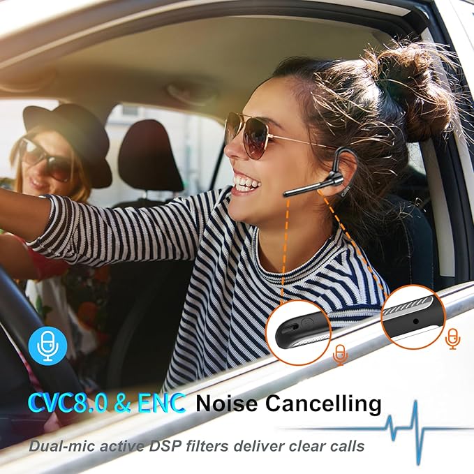 - ADVANCED CVC8.0 DUAL MIC NOISE CANCELLING - The Bluetooth headset Built-in HD Mic ENC features advanced CVC8.0 noise cancelling and Digital Signal Processing (DSP) technology for clear and smooth conversations. Qualcomm aptX HD delivers crystal clear audio and natural sound wherever. Ensure clearer and more efficient calls.