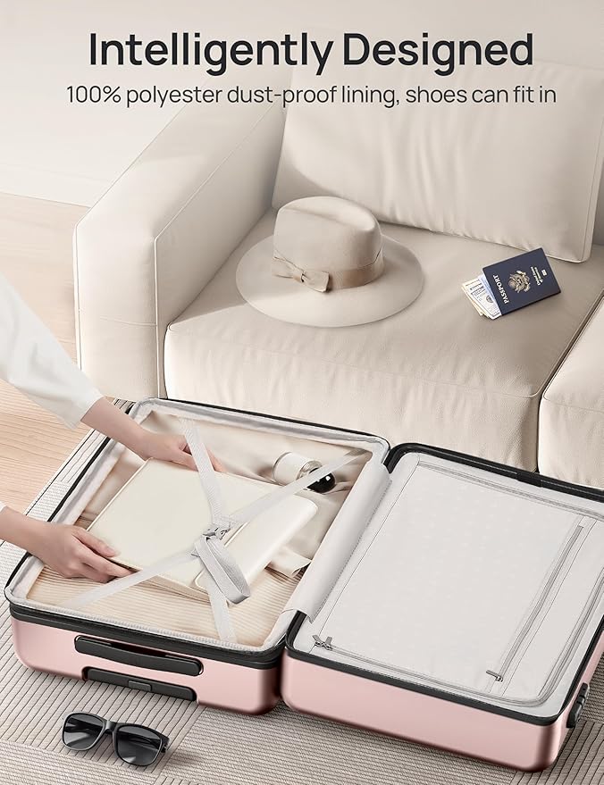 - 【Smooth Glide Wheels】Featuring 4 silent, double spinner wheels, this suitcase glides effortlessly through crowded airports and uneven surfaces. The smooth and quiet rolling ensures a stress-free travel experience, whether you're rushing to a gate or navigating city streets.