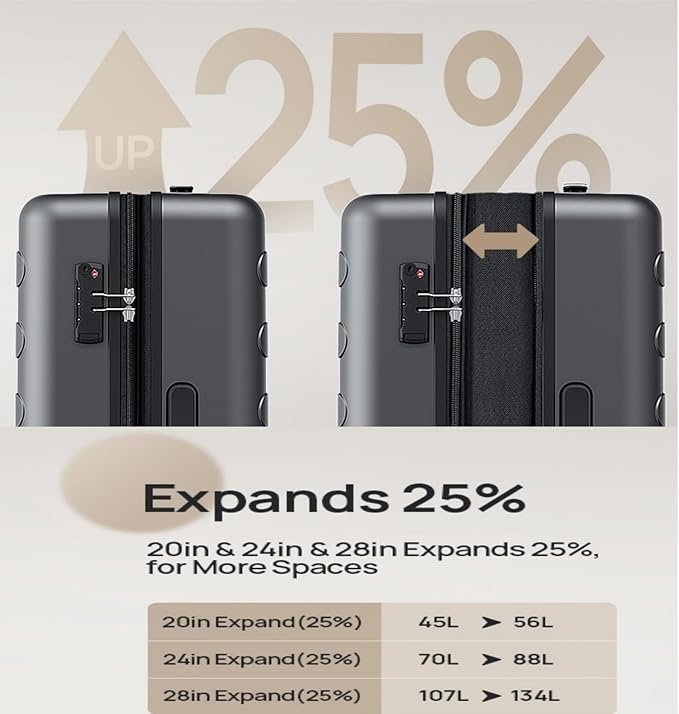 - 【Complete Travel Solution】This 3-piece set includes a 20-inch carry-on (21.65" x 14.17" x 9.06", 38L capacity, expandable to 43L), a 24-inch medium suitcase (25.59" x 16.54" x 10.63", 63L capacity, expandable to 71L), and a 28-inch large suitcase (30.31" x 17.72" x 11.61", 107L capacity, expandable to 121L), covering all your travel needs. Whether it’s a weekend trip or a family vacation, this set has you covered.