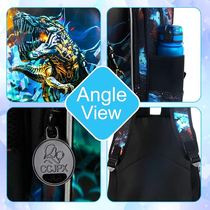 - 【Backpack with Lunch Box Design】This dinosaur backpack is made of high quality upgraded waterproof material with smooth zippers that are easy to protect and clean.The front pocket is personalized with UV dinosaur printable technology, which makes the dinosaur colorful and lifelike. There is a ring of reflective strips around the front pockets to keep kids safe at night.