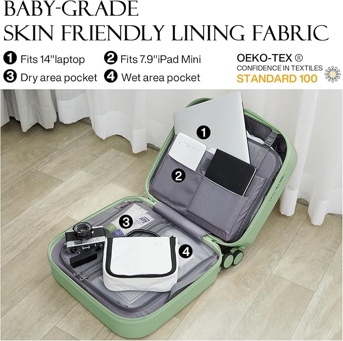 mixi Carry on Luggage, Suitcase with Spinner Wheels 16in Luggage Hardshell Lightweight Rolling Suitcases PC with Cover & TSA Lock, Avocado Green