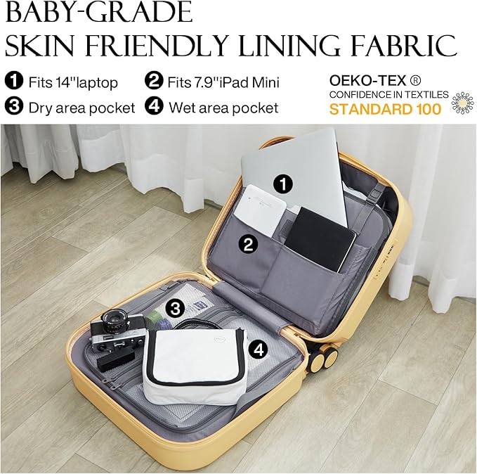 mixi Carry on Luggage, Suitcase with Spinner Wheels 16in Luggage Hardshell Lightweight Rolling Suitcases PC with Cover & TSA Lock, Lark Yellow