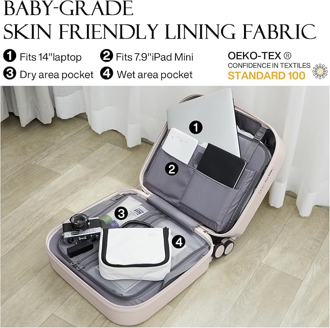 mixi Carry on Luggage, Suitcase with Spinner Wheels 16in Luggage Hardshell Lightweight Rolling Suitcases PC with Cover & TSA Lock, Off White(Slight Pink)
