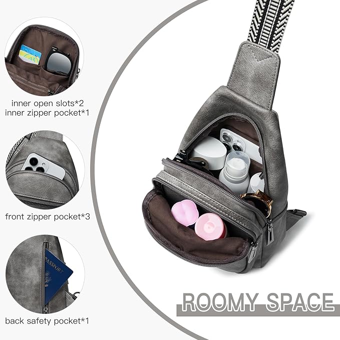 - ✓Spacious Capacity:This sling bag for women crossbody purses has three zippered pockets in the front,a side zipper pocket in the back,built in a zipper pocket and two opening slots in the largest compartment.it can hold ipad mini,umbrella,powerbank,phone,money/cards,passport,boarding passes,airpods,wet wipes,lens wipes and make up etc.without bulky.