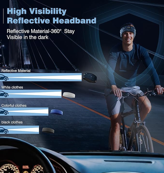- High Visibility Reflective Headband: The 360 °reflective black headband headphones is made of high quality reflective material, which can effectively reflect the light from the street lamps or headlights, so that you can be seen more easily in the dark.