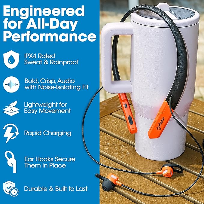 - Sweat- & Weather-Ready – IPX4-rated for water resistance. Our neckband bluetooth earbuds withstand sweat, rain, and dust, making them dependable earbuds for work in warehouses, outdoors, or on tough shifts.