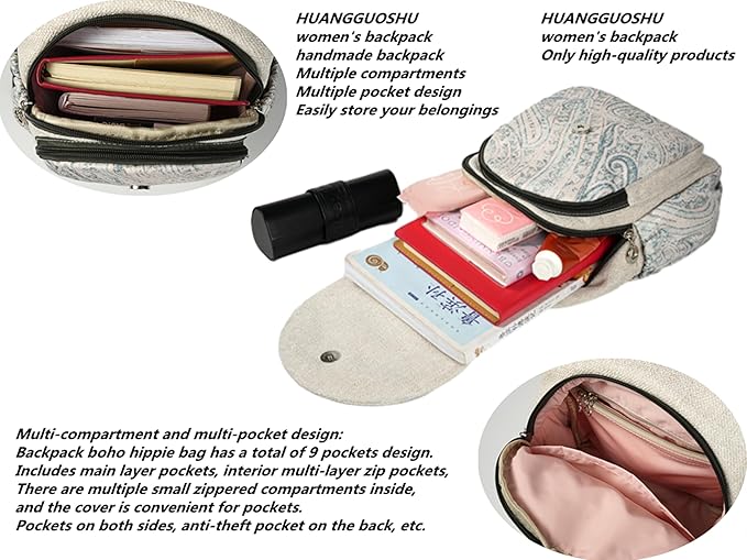 - [Original Design] Women's travel bag is made of high-quality cotton and linen with hand-woven decoration, soft and wear-resistant, equipped with strong heavy-duty zippers and metal buckles. Dimensions are 13*10*5 inches and weight is approximately 1.1 lbs. This is a lightweight backpack.