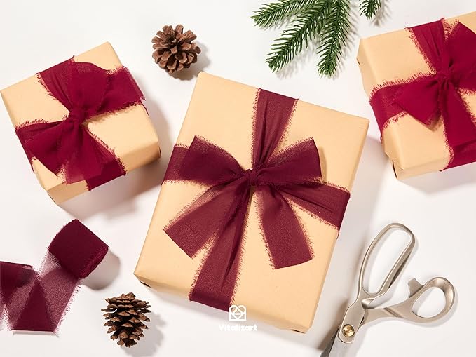 Vitalizart Red Handmade Chiffon Silk Ribbon Fringe 1.5" x 21 Yd Burgundy Frayed Edges Ribbons for Wedding Invitations Bridal Bouquets Gifts Wrapping Crafts Holiday Party Decorations