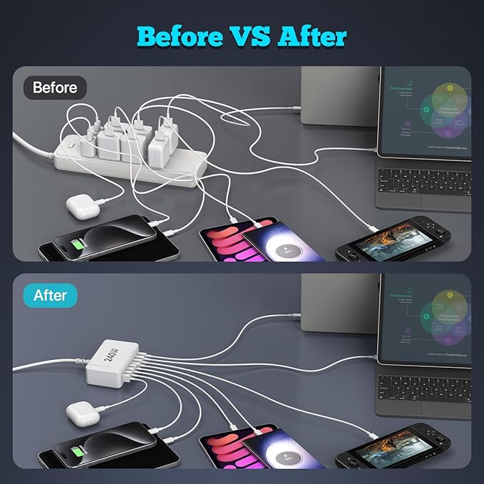 - ✅【Portable and compact】The multi port charging station is compact and portable, making it easy to charge in schools, offices, homes, and travel. The 8-port charger perfectly integrates the C and A ports, and the multi port design of the charging head makes charging more convenient without the need for multiple chargers or adapters. This will make your desk cleaner and you can bid farewell to messy charging cables. The 1.5 meter long AC charging cable allows you to charge freely without worrying about distance limitations.