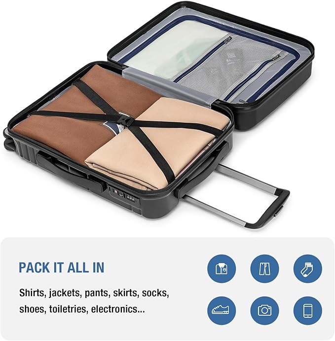 - SPACIOUS INTERIOR: These hardshell expandable 22x14x9 carry-on luggage has multiple storage compartments for easy packing.The main compartment has "X"-shaped cross straps to keep clothes in place. The left side compartment has two zipped mesh pockets for wet and dry storage.Soft silicone handles on the top and sides provide a variety of comfortable carrying options