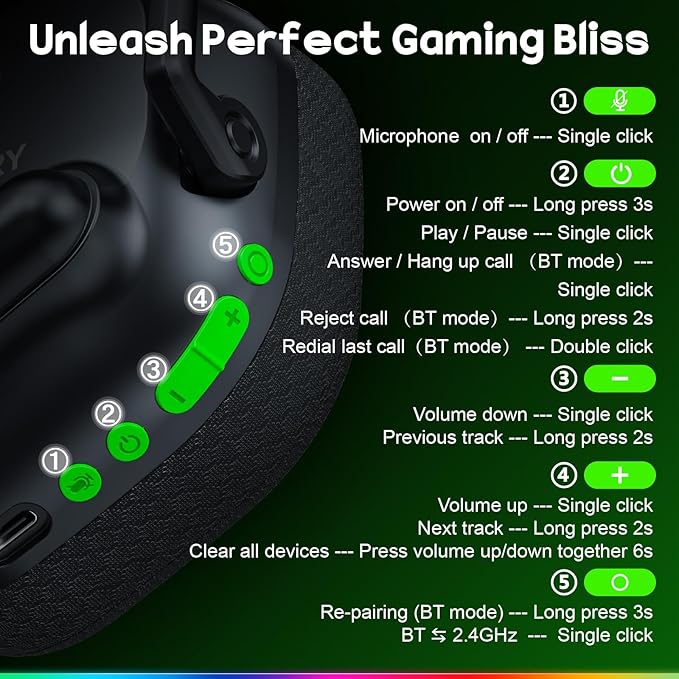 - đ ăUltimate Compatibility Across DevicesăThis Gaming headsets are your go-to solution for versatile connectivity. The 2.4GHz dongle mode ensures flawless performance with a gaming headset compatible with PS5, PC, PS4, Switch, Mac, and laptops. The Bluetooth mode is easily compatible with PC, Mac, Mobiles, tablets, and laptops.đŤ Note: Bluetooth mode is NOT compatible with PS4/PS5.â Both modes are NOT compatible with all Xbox.â ď¸ The microphone is NOT compatible with Switch.