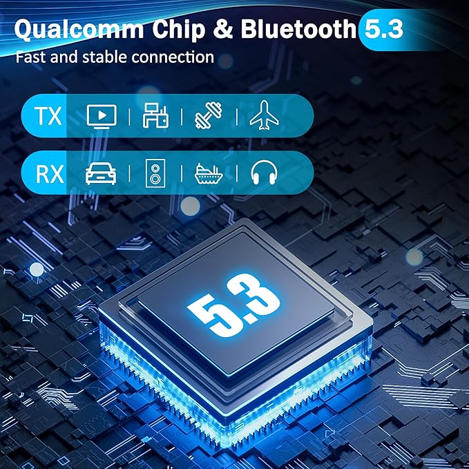 - Bluetooth 5.3 & Qualcomm Chip: Swiitech Bluetooth transmitter receiver adopts Bluetooth 5.3 and a Qualcomm Chip, which ensures stable and fast connections. In TX mode and transmit audio signals in an airplane or with TVs that do not support Bluetooth to Bluetooth wireless devices. With a transmission distance of up to 10 meters, which a great flying companion