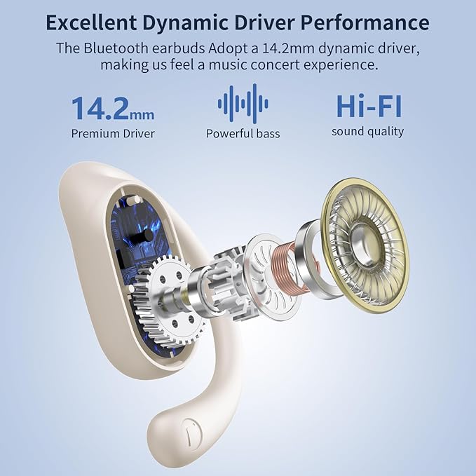 - Excellent Sound Quality, Perceive Surroundings: This open ear earbuds wireless bluetooth has excellent sound transmission performance and is designed for a 14.2mm vibration diaphragm speaker driver. These open ear headphones deliver deep bass and clear stereo sound for a natural, rich listening experience. Equipped with a microphone for superior call clarity. Open ear headphones allow you can easily perceive the changes in the surrounding environment while enjoying the music, ensuring the safety and comfort of use