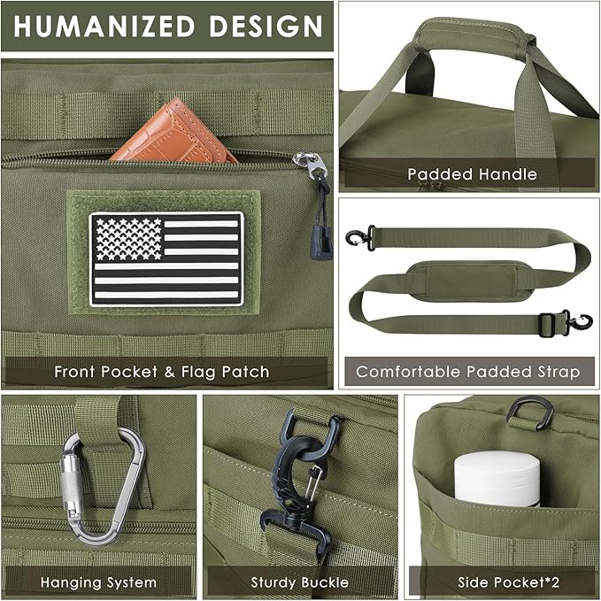 - Tactical Duffle Bag's MOLLE System: Military bag is designed with patch panels on the front and sides for attaching name patches and morale patches. The MOLLE webbing of the tactical bag can be used to attach extra gear you need. The military look duffle bag for men meets the greatest demands of outdoor explorers, military enthusiasts and fashion trendsetters for travel bags
