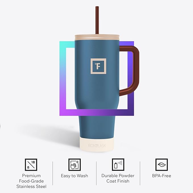IRON °FLASK Co-Pilot Insulated Mug w/Boot, Straw & Flip Cap Lids - Cup Holder Bottle for Hot, Cold Drink - Leak-Proof - Water, Coffee Portable Travel Mug - Azure Mist, 40 Oz