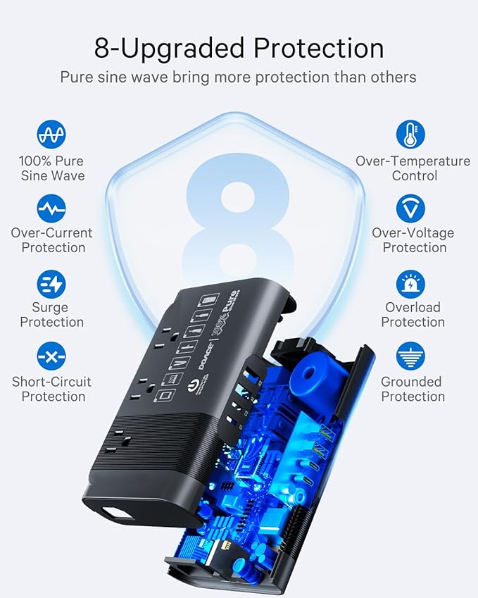 - [100% Pure Sine Wave Save Your Devices] Pure sine wave power is a quieter, cleaner, and more reliable power source than you use at home. DOACE Travel Converter can output high-quality pure sine wave voltage to protect your electronic devices, appliances with motors, audio and video equipment, and medical equipment.