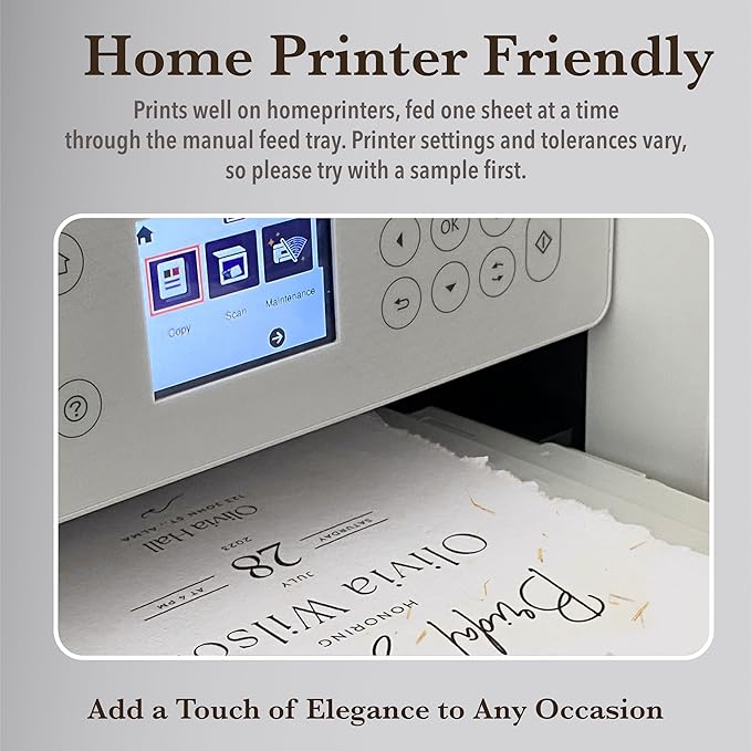 - [Inkjet & Laser Printer Compatible – Printable Deckle Edge Paper]: Compatible with inkjet and laser printers, perfect for printing menus, save the date cards, name cards, wedding invitations, thank you cards, Easter cards, and DIY invitations. Great for journal pages, printing photos, or creating card sets. Use manual feed for best results. Includes A5 paper for personalized stationary and crafts