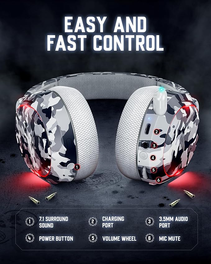 Wireless Gaming Headset, 7.1 Surround Sound, 2.4GHz USB Gaming Headphones with Bluetooth 5.4, 100H Battery, ENC Noise Canceling Mic, RGB Light, Wireless Headset for PC PS5 PS4 Mac Switch (Camo)