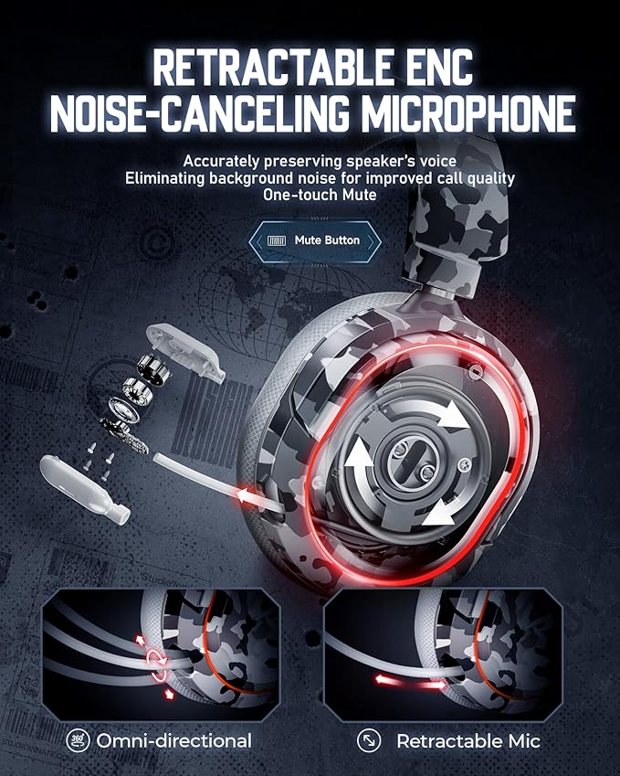 - 🎙️【Retractable ENC Noise-Canceling Microphone & One-touch Mute】Equipped with a 360° omnidirectional Noise-Canceling microphone. Our wireless headset can accurately calculate the speaker's direction, preserving the target voice while eliminating background noise for improved call quality. Gaming headsets with mic ensure your voice are relayed in high-definition clarity to your teammates, even in the heat of battle. Meanwhile, the retractable microphone combines the advantages of various types of microphones: ultra-low latency, high sound reproduction, concealability, and portability, the perfect gift for gamers and music enthusiasts.