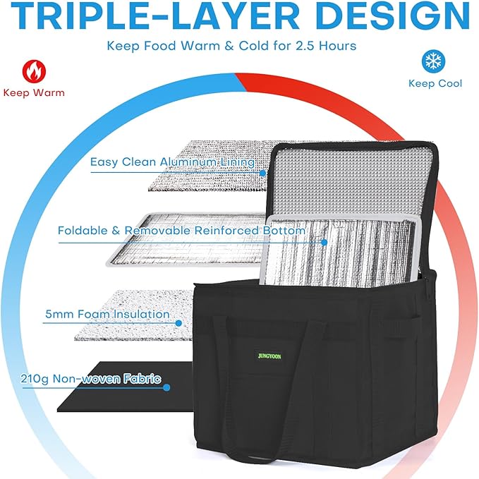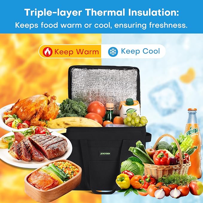 JUNGYOON S Insulated Grocery Bags and Cooler Bag for Food Delivery Bag, Collapsible Cooler, Reusable Shopping Bags for Groceries with Zipper Top, Heavy Duty, Stands Upright(Black)