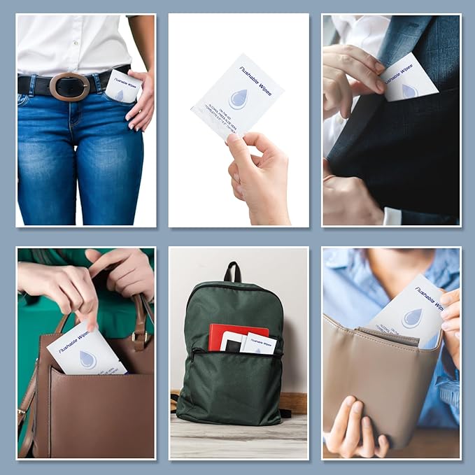 - Perfect on the go travel wipes: flushable wipes unscented have a size of 5.5 x 6.3 inches and an outer packaging of 2.4 x 3.1 inches. The mini design is perfect for backpack wipes, camping wipes, and even apartment essentials. Compact and lightweight, flushable Wipes for Adults doesn't take up too much space, so you can put it in your pocket, makeup bag, and wallet