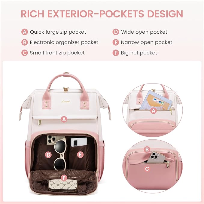 LOVEVOOK Leather Backpack for Women,17 inch Leather Laptop Backpack Women,Professional Work Backpack Nurse College Teacher Bag,Womens Laptop Tote Bag Computer Travel Backpack Purse,Beige White-Pink