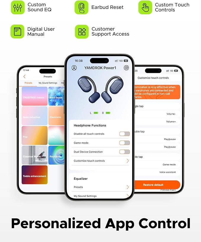 - ๐๐ฎ๐ฌ๐ญ๐จ๐ฆ๐ข๐ณ๐๐๐ฅ๐ ๐๐ ๐ฐ๐ข๐ญ๐ก ๐๐๐ ๐๐จ๐ซ ๐๐๐ซ๐๐๐๐ญ ๐๐จ๐ฎ๐ง๐: These earbuds are compatible with Android and iOS systems. Try to download our "Truefree" app from Google Play or the App Store to customize your experience. You can adjust the equalizer to your preferences, reset your headphones, and personalize touch controls. The app also offers one-on-one troubleshooting, detailed electronic manuals, and more information about our products.