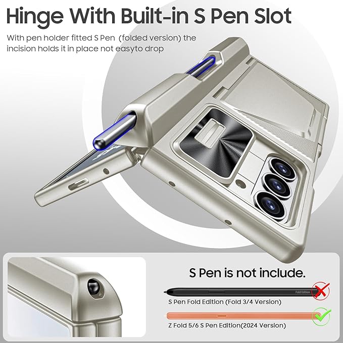 - Hinge Protection & Built-in S Pen Holder: The external convenient pen holder puts the S pen within easy reach, allowing you to express your creativity at any time. Both ends are equipped with mechanical latches that can firmly lock the S pen, making it safer than ever. The self-rebound hinge cover always fits tightly with the Galaxy fold 6 hinge, always protecting the hinge from scratches and drops