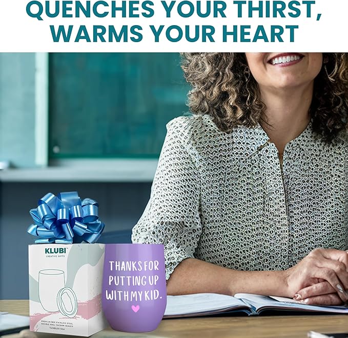 KLUBI Daycare Provider Gifts - Thanks For Putting Up With My Kid Tumbler 12oz Purple Coffee Mug Daycare Teacher Gifts for Teacher Appreciation for Women - Happy Teachers Week Gift for Her