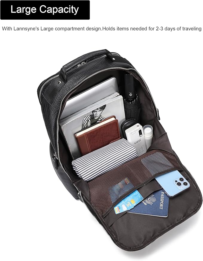 - Multi-Pockets Design: The leather travel backpack for men has 30L large capacity can carry on 17.3 inch laptop, it also has 3 main compartments, 3 front zipper pockets, 2 side pockets fits water bottle/umbrella/mini iPad, 2 glasses strap and 1 luggage strap.