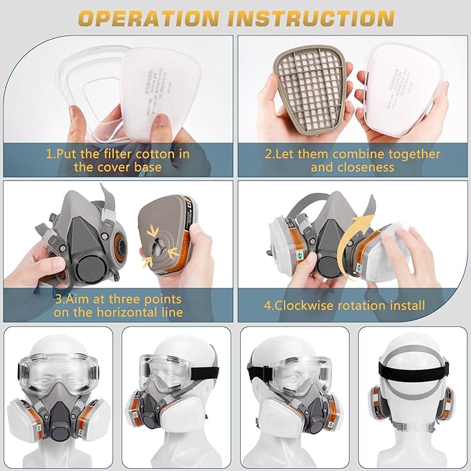 - 👍 【Double Respirator Set】: We provide you the new protective respirator set includes: 2 x 6200 half face respirators, 2 x Safety Goggles, 20 x filter cottons, 4x 6001 filter boxes, 4 x plastic fixed covers, We provide you with more satisfactory protective equipment.