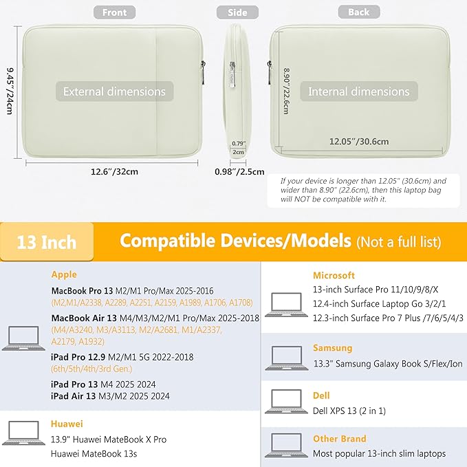 - Internal Dimensions: 12.05" x 8.9" x 0.79". Compatible with MacBook Air 13 M4/M3/M2/M1 2025-2018 (A3240, A3113, A2681, A2337, A2179, A1932), MacBook Pro 13 M2/M1 Pro/Max 2025-2016 (A2338, A2289, A2251, A2159, A1989, A1706, A1708), Dell XPS 13, 13"-12.3" Surface Pro, 12.4" Surface Laptop Go, iPad Pro 13 M4, iPad Air 13 M3/M2, iPad Pro 12.9 2022-2018, Huawei MateBook 13s, 13.9" Huawei MateBook X Pro, 13.3" Samsung Galaxy Book S/Flex/Ion, and most 12"-13" slim laptops/tablets, etc.