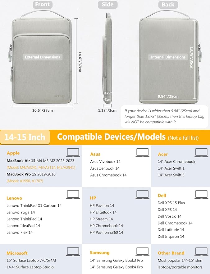 - Internal Dimensions: 13.78" x 9.84" x 0.79". Compatible with MacBook Air 15 M4 M3 M2 2025-2023 (A3241/A3114/A2941), MacBook Pro 15 2019-2016 (A1990/A1707), 14" HP Pavilion/EliteBook/Stream/Chromebook/Pavilion X360, 14" Dell Vostro/Chromebook/Latitude/Inspiron, Dell XPS 14/15 Plus, 15" Surface Laptop, 14.4" Surface Laptop Studio, 14" Acer Chromebook/Swift 1/3, ThinkPad X1 Carbon/Yoga 14, ThinkPad/IdeaPad/Flex/Yoga 14, Asus Vivobook/Zenbook/Chromebook 14, 14" Samsung Galaxy Book3/Book4 Pro, etc.