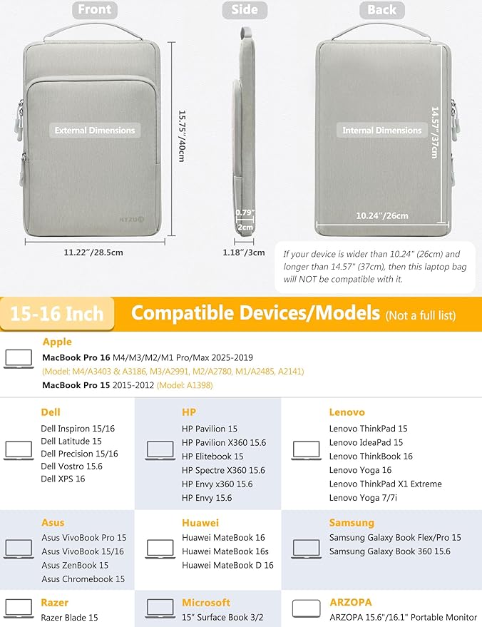 - Internal Dimensions: 14.57" x 10.24" x 0.79". Compatible with MacBook Pro 16 M4/M3/M2/M1 Pro/Max 2025-2019 (A3186, A3403, A2991 A2780 A2485 A2141), MacBook Pro 15 2015-2012 (A1398), 15" Surface Book, Dell Inspiron/Latitude/Precision/Vostro 15, HP Pavilion/Elitebook/Envy 15, HP Pavilion/Spectre/Envy X360 15.6, Samsung Galaxy Book Flex/Pro 15, Lenovo IdeaPad/ThinkPad 15, Yoga/ThinkBook 16, Asus ZenBook/VivoBook Pro 15, VivoBook 15/16, Razer Blade 15, ARZOPA 15.6"/16.1" Portable Monitor, etc.