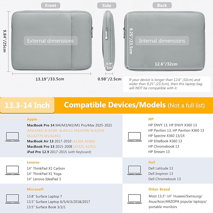 - Internal Dimensions: 12.6" x 9.25" x 0.79". Compatible with MacBook Pro 14 M4/M3/M2/M1 Pro/Max 2025-2021 (Model: A3401, A3185, A3112, A2992, A2918, A2779, A2442), MacBook Air 13 2017-2010, MacBook Pro 13 2015-2012, HP Envy/Stream/Pavilion/Chromebook 13, HP EliteBook X360 13, HP Spectre X360 13/14, iPad Pro 12.9 2017-2015, ASUS Zenbook/Vivobook/Chromebook 13, 13.8"-13.5" Surface Laptop/Book, Dell Latitude/Inspiron/Chromebook 13, 13.3" ThinkPad X390, and most 13"-13.3" slim laptops, etc.