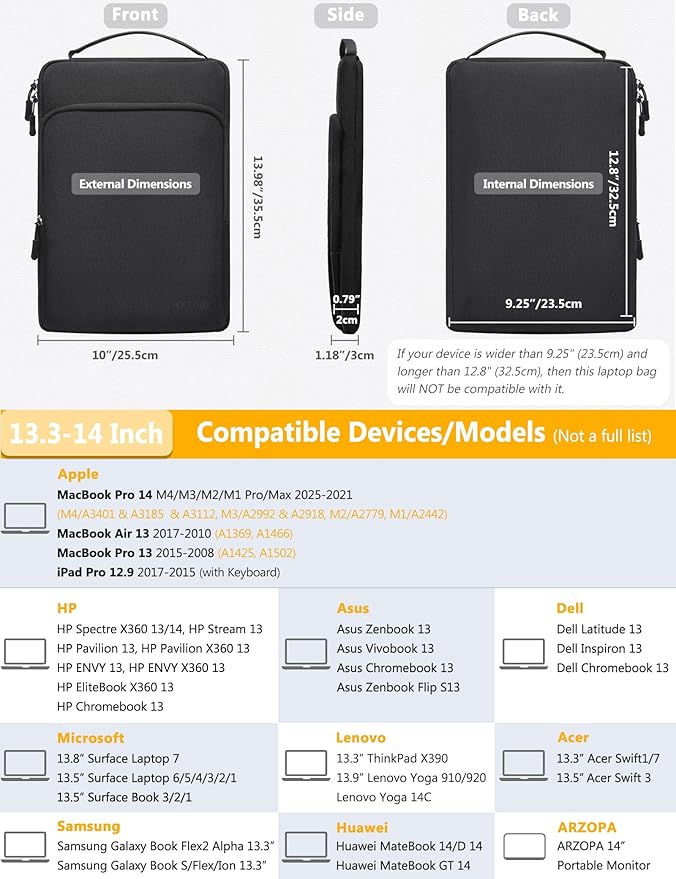 - Internal Dimensions: 12.8" x 9.25" x 0.79". Compatible with MacBook Pro 14 M4/M3/M2/M1 Pro/Max 2025-2021 (Model: A3401, A3185, A3112, A2992, A2918, A2779, A2442), MacBook Air 13 2017-2010, MacBook Pro 13 2015-2012, iPad Pro 12.9 2017-2015, 13.8"-13.5" Surface Laptop/Book, HP EliteBook x360 13, HP Envy/Stream/Pavilion/Chromebook 13, HP Spectre X360 13/14, Dell Latitude/Inspiron/Chromebook 13, ASUS Zenbook/Vivobook/Chromebook 13, 13.3" ThinkPad X390, and most 13"-13.3" slim laptops, etc.