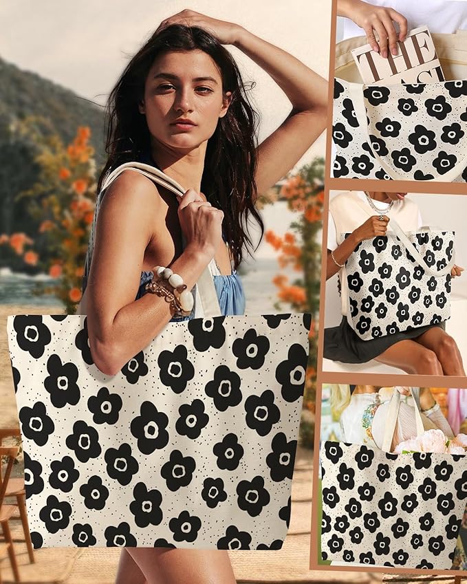 Large Tote Bag for Women - Canvas Tote Bag with Zipper Aesthetic Reusable Shoulder Bag for Gym, Travel, Work