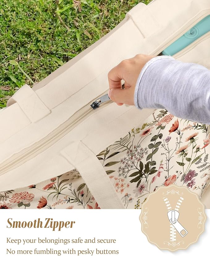 Large Tote Bag for Women - Canvas Tote Bag with Zipper Aesthetic Reusable Shoulder Bag for Gym, Travel, Work