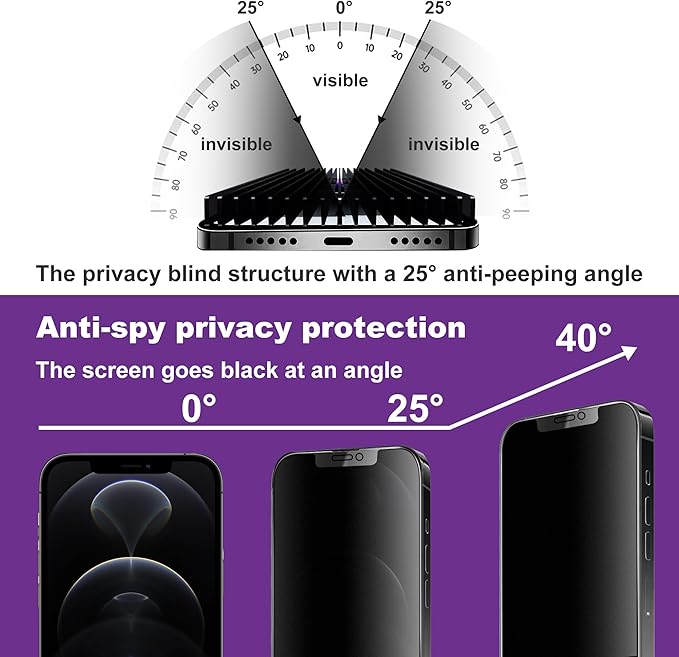 - 25 Degrees of Privacy: privacy screen iphone 12 pro max Tempered Glass Screen Protector. True 25 degree privacy protection Perfect for preventing prying eyes from seeing what you're doing on your Ideal for wearing in public